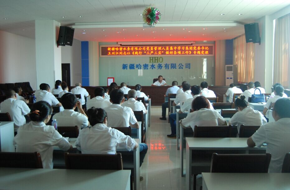 2015年8月3日,新疆哈密水務(wù)有限公司在六樓會議室,集中組織公司黨員、管理人員60余名學習了集團公司黨委書記王川江同志以踐行“三嚴三實”,做好各項工作為主題的專題黨課。王川江同志深刻講述了一開展“三嚴三實”專題教育的重要意義;二深刻理解“三嚴三實”的科學內(nèi)涵,著力解決“不嚴不實”的突出問題,針對張春賢書記在自治區(qū)縣處以上領(lǐng)導(dǎo)干部專題黨課上,從修身不嚴、用權(quán)不嚴、律己不嚴、謀事不實、創(chuàng)業(yè)不實、做人不實等方面結(jié)合目前現(xiàn)狀做了詳細闡述;三圍繞務(wù)求實效,把握關(guān)鍵環(huán)節(jié),凝心聚力積極做好下半年各項工作;四加強組織領(lǐng)導(dǎo),落實黨委主體責任,切實推動專題深入有序開展。