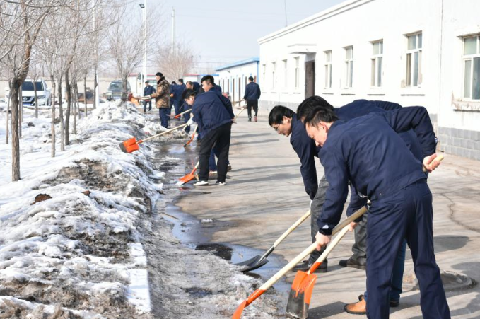 下午16點整,準東供水公司基地各部門職工在大門口整齊列隊,鮮艷的黨旗、團旗在和煦的春風中飄揚。公司黨總支帶領黨員、青年、團員準備好工器具,對停車場、綠化帶兩邊、戶外籃球場、宿舍門前道路、路沿石上的積冰積雪進行徹底清掃,對職工文體活動中心進行衛生清潔。