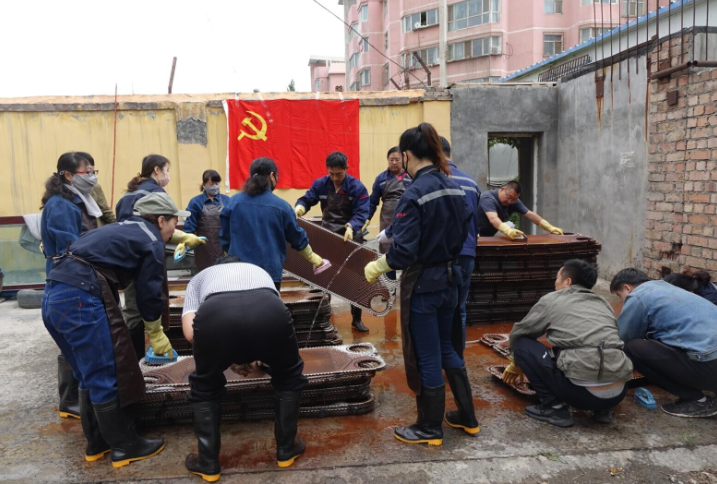 活動開始,公司黨員干部職工在技術人員指導下,統一佩戴好勞動防護用具,投入到緊張有序的清洗板換工作中,大家不怕臟、不怕累,認真仔細清洗板換。通過此次活動,提高了大家的凝聚力和愛廠如家的思想意識,充分發揮吃苦在前、享受在后的黨員先鋒模范作用和黨支部戰斗堡壘作用。