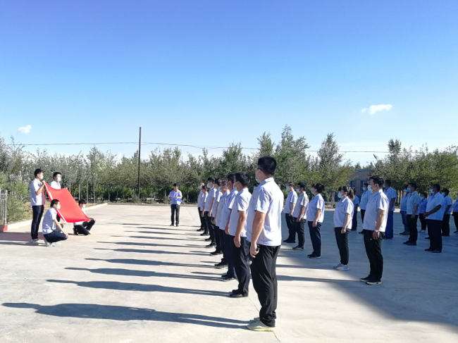 公司在職黨員和干部職工按照防疫要求佩戴口罩、間隔有序地在職工文體活動中心升旗廣場參加升旗儀式,隨后全體黨員在黨總支書記楊杰成同志的領誓下,面對黨旗重溫入黨誓詞,大家緊握右拳,莊嚴宣誓,追憶初心,反思使命,表達自己的決心與信念。